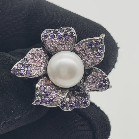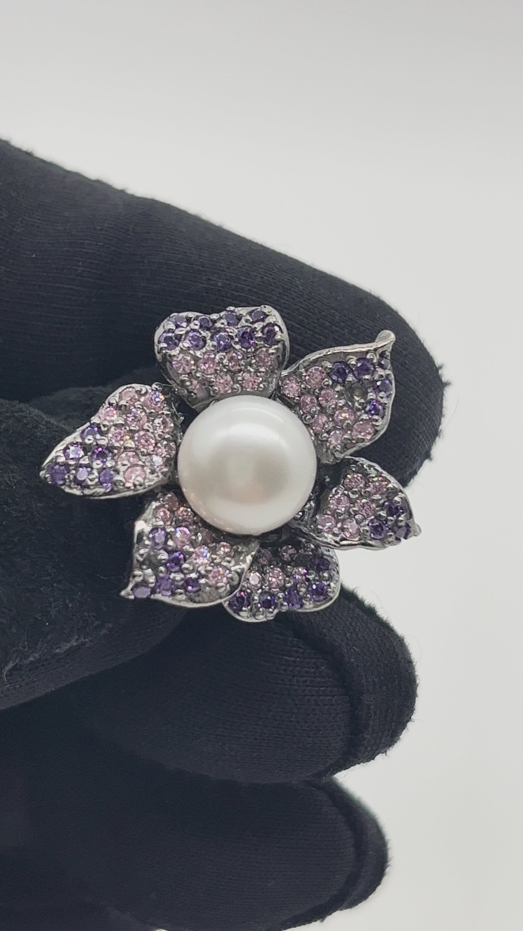 Anillo con diseño floral en plata 925, adornado con una perla auténtica y piedras Rondel en tonalidades morado oscuro y claro. Una pieza sofisticada que aporta el detalle perfecto para completar tu look nocturno.