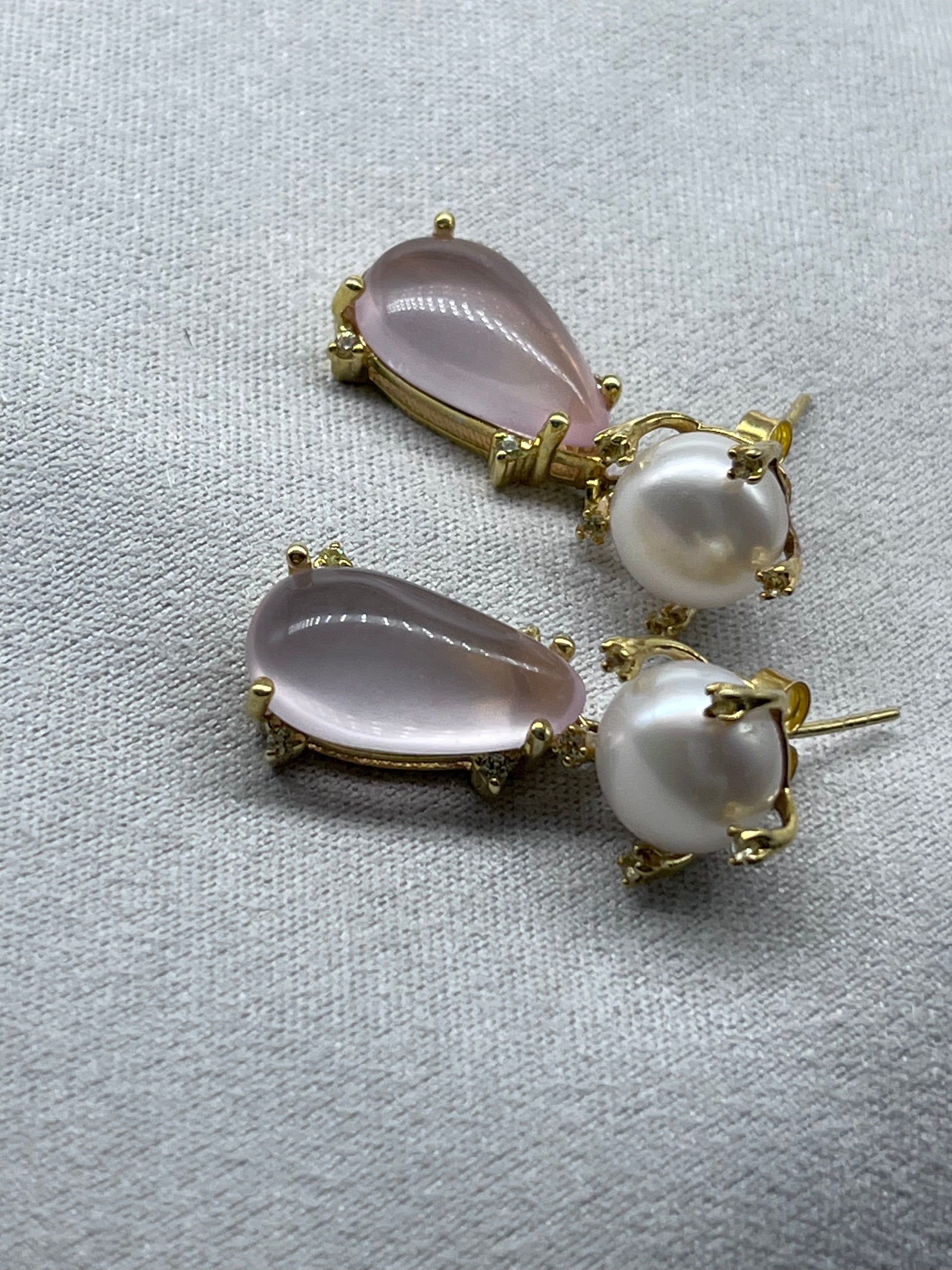 These elegant 12 x 19 mm drop-shaped earrings combine the gentle glow of rose quartz with the classic sheen of pearls. Crafted in sterling silver (925) and finished with an 18K gold plating, they offer both durability and refined luxury. Perfect for adding a subtle yet sophisticated touch to any outfit, these earrings balance natural beauty with expert craftsmanship.