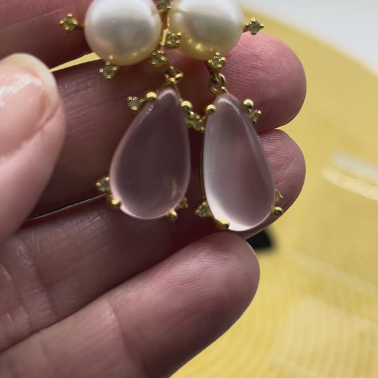 Gemstone 12 x 19 mm. Rose Quartz & Pearl Earrings 925 Silver 18K Gold