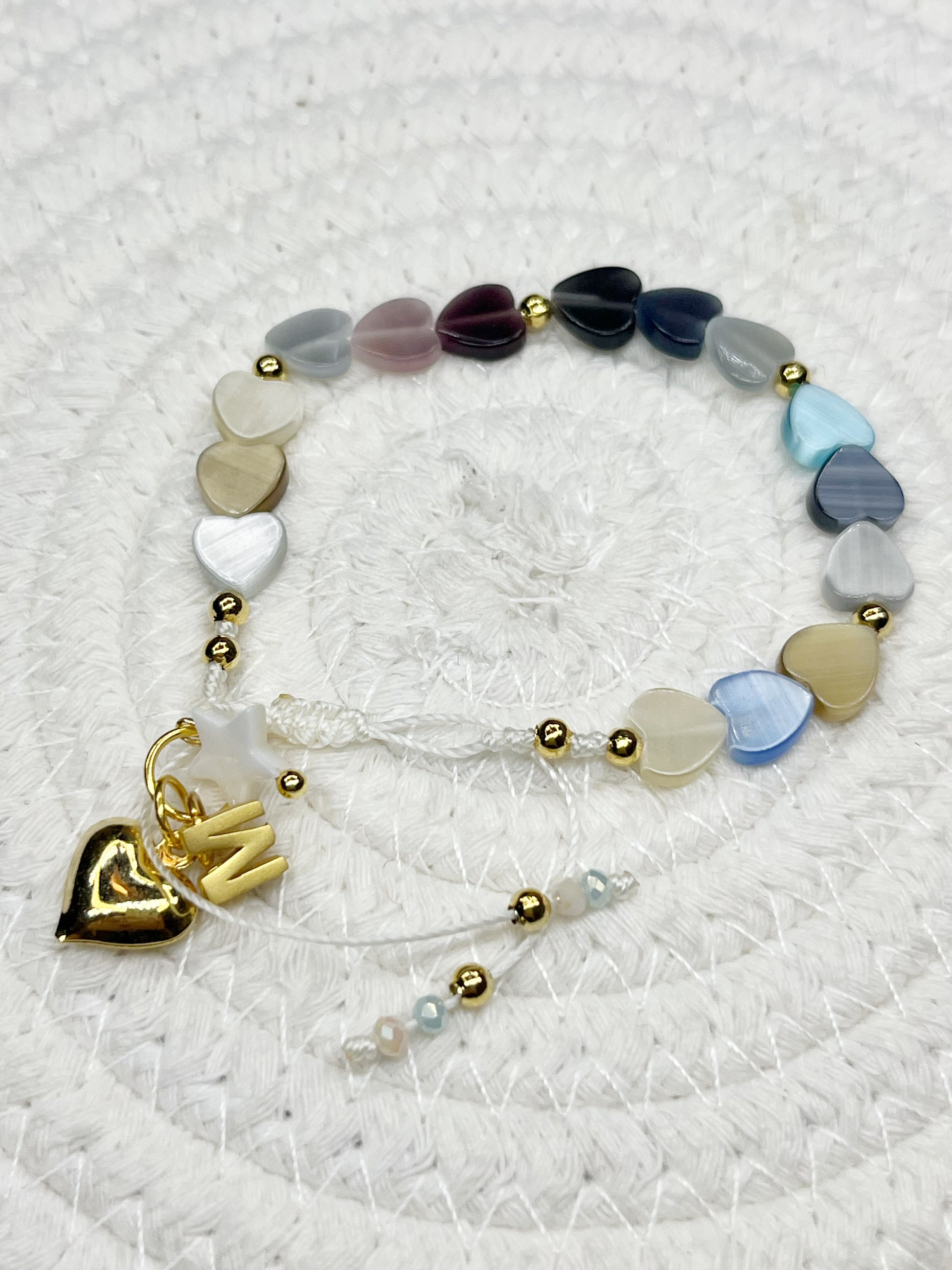 Esta pulsera ajustable presenta delicados corazones en nácar, que aportan un brillo sutil y elegante. Su diseño adaptable garantiza un ajuste cómodo para cualquier tamaño de muñeca, combinando estética artesanal con funcionalidad práctica. Perfecta para realzar cualquier look con un toque sofisticado y natural.
