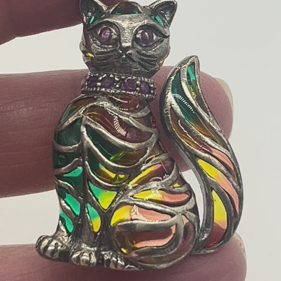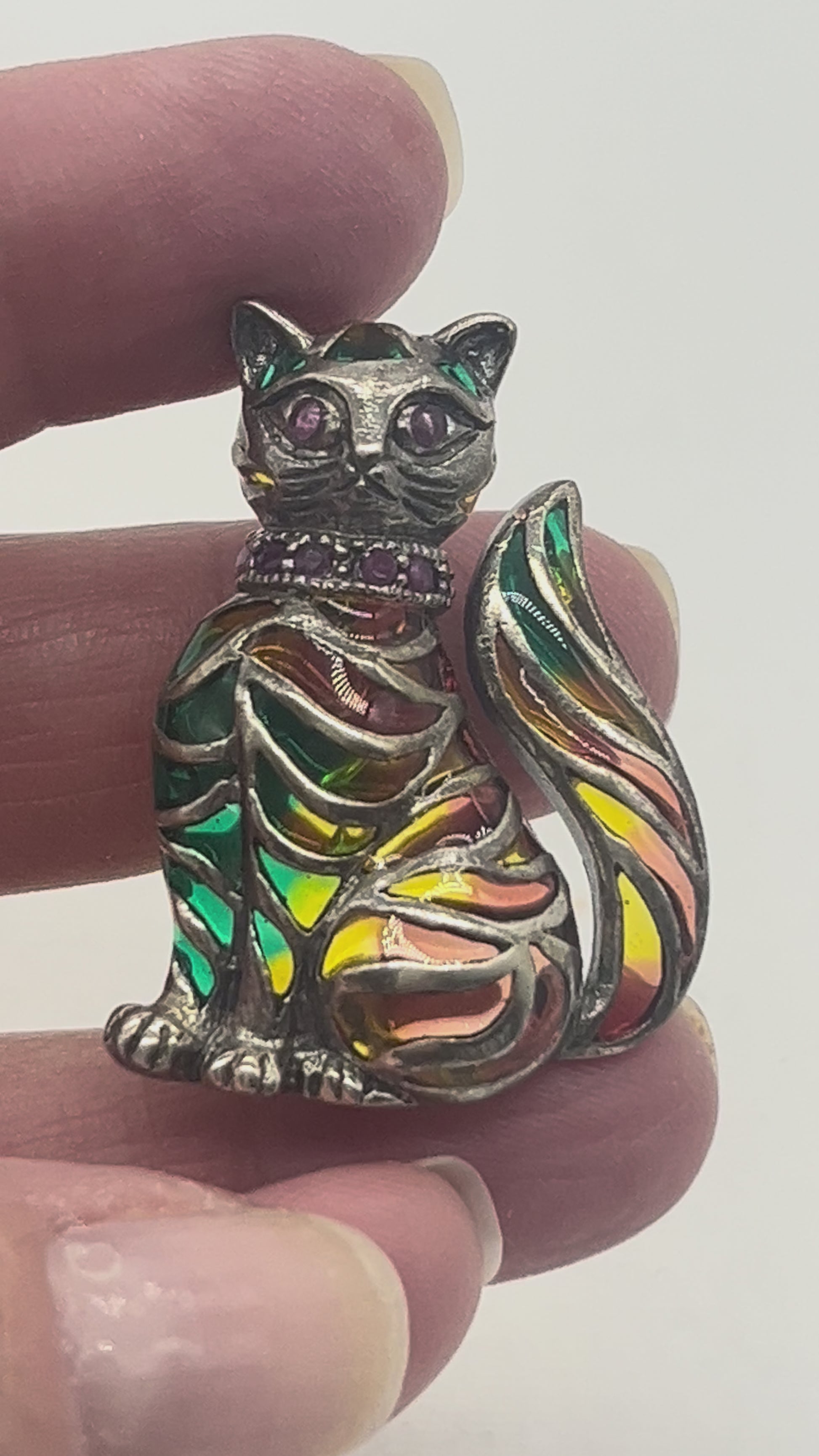 Vintage plata fina 925 Plique A Jour par de broche /colgante de gato esmaltado