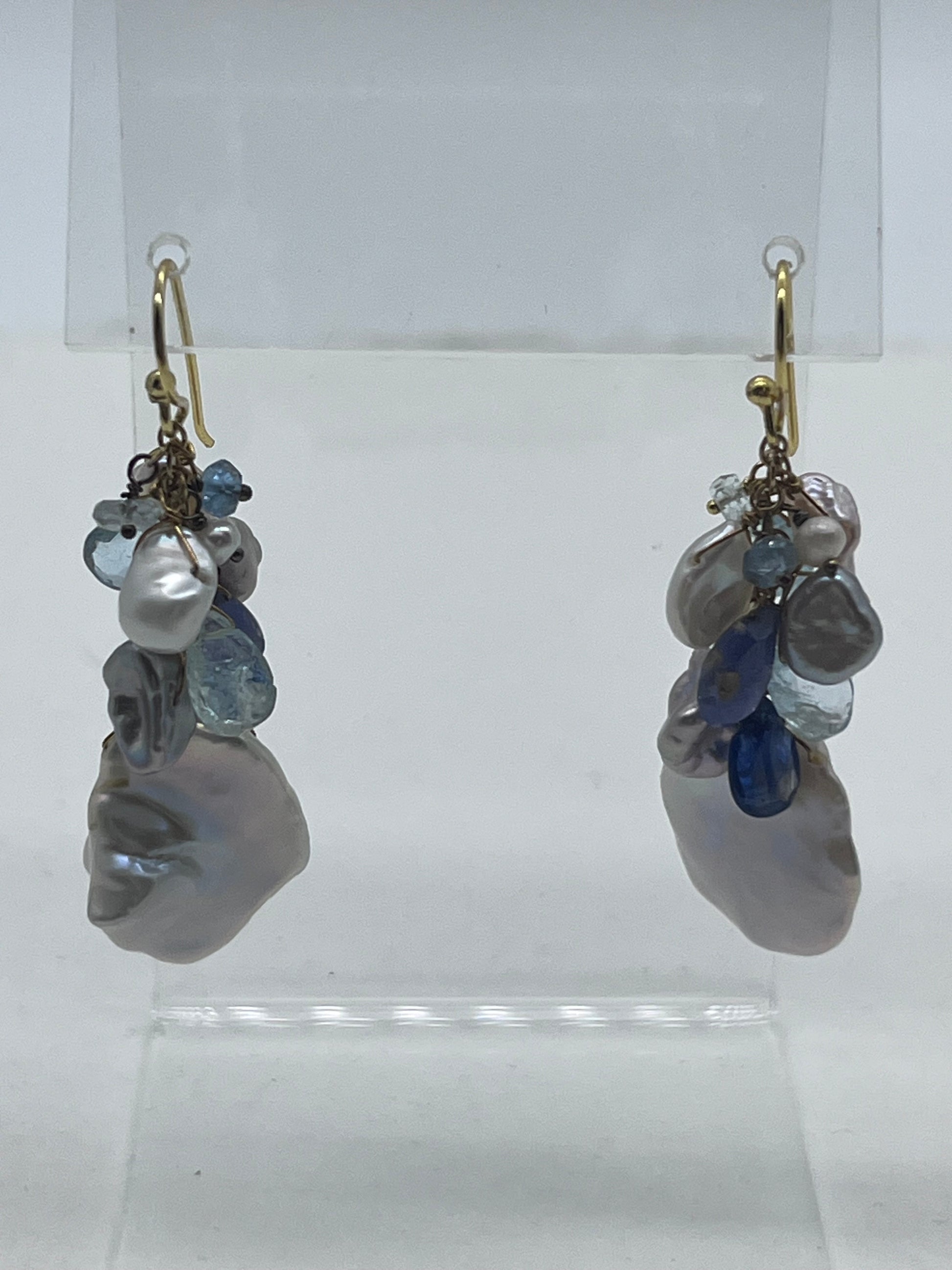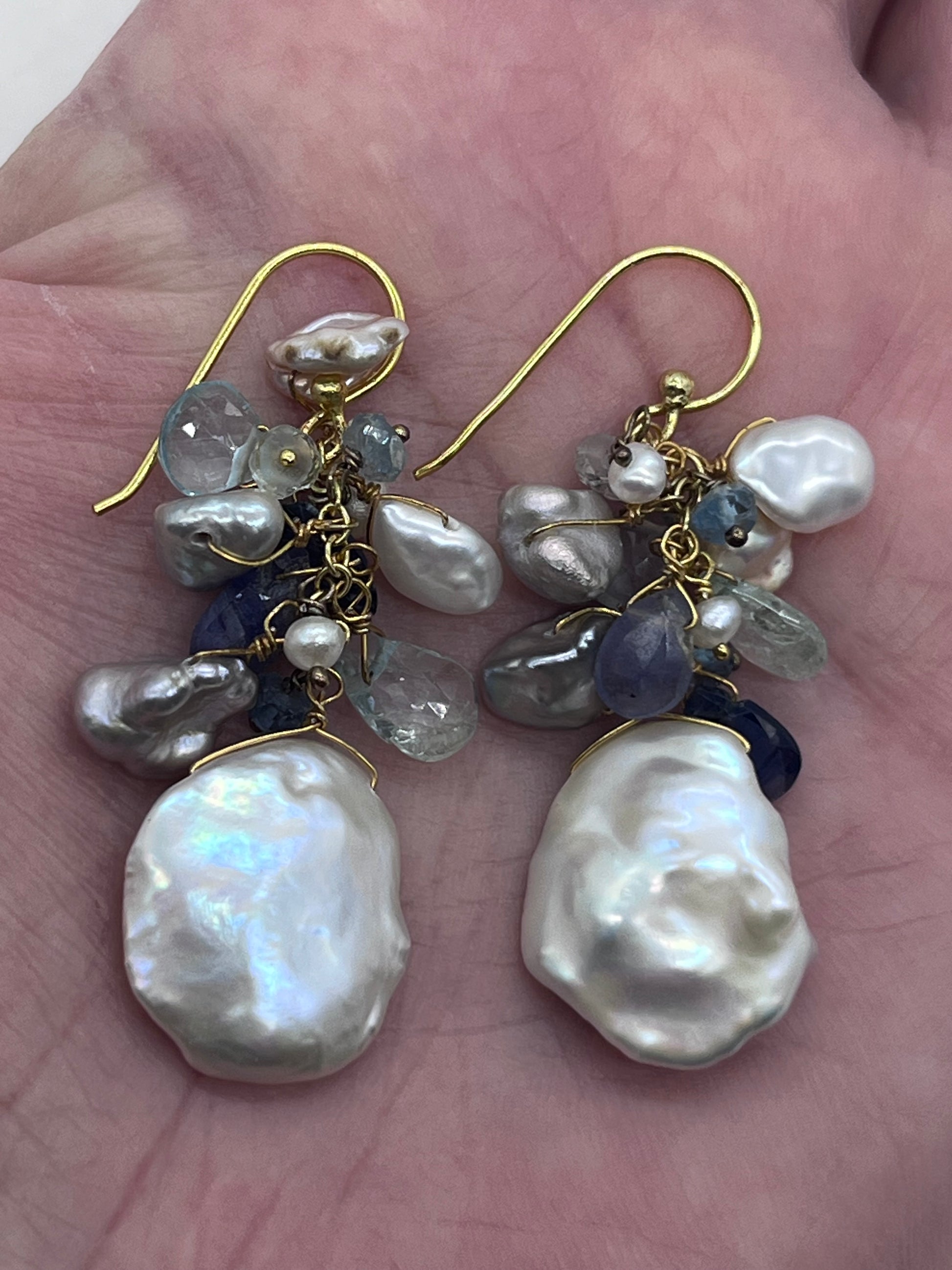 Perlas grises arco iris con cianita, piedras lunares, aguamarinas en joyas rellenas de oro